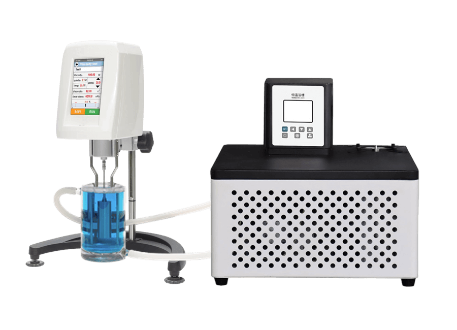 A rotary viscometer for testing the viscosity of samples in a bath.