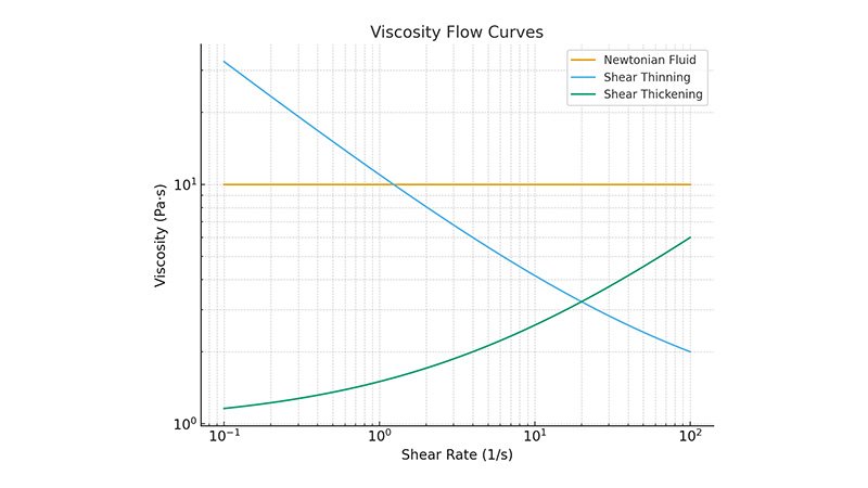 A viscosity flow curve is a graph that shows how a fluid's viscosity changes as the shear rate (force) applied to it changes. This data helps predict how the material will behave during pumping, mixing, and application.